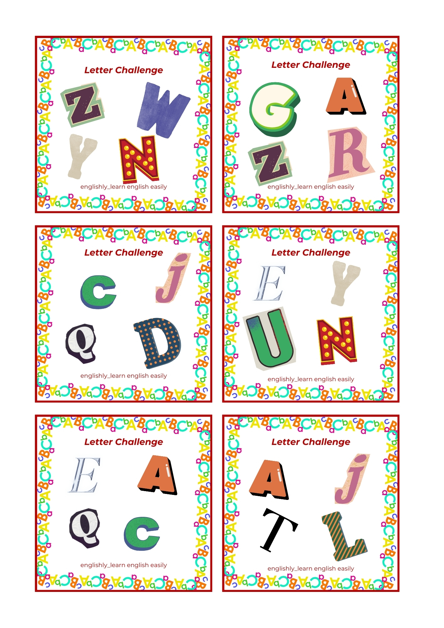 Na każdej karcie znajdują się 4 różne litery alfabetu.